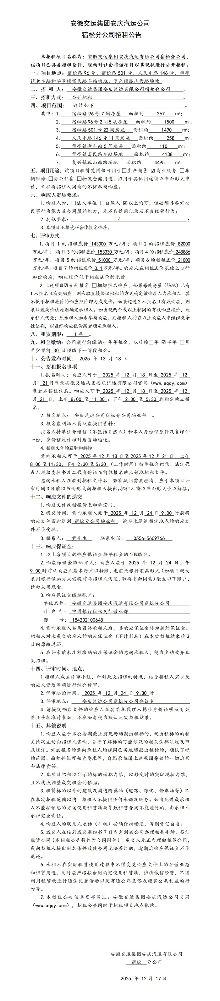 宿松分公司房屋(場地)招租公告