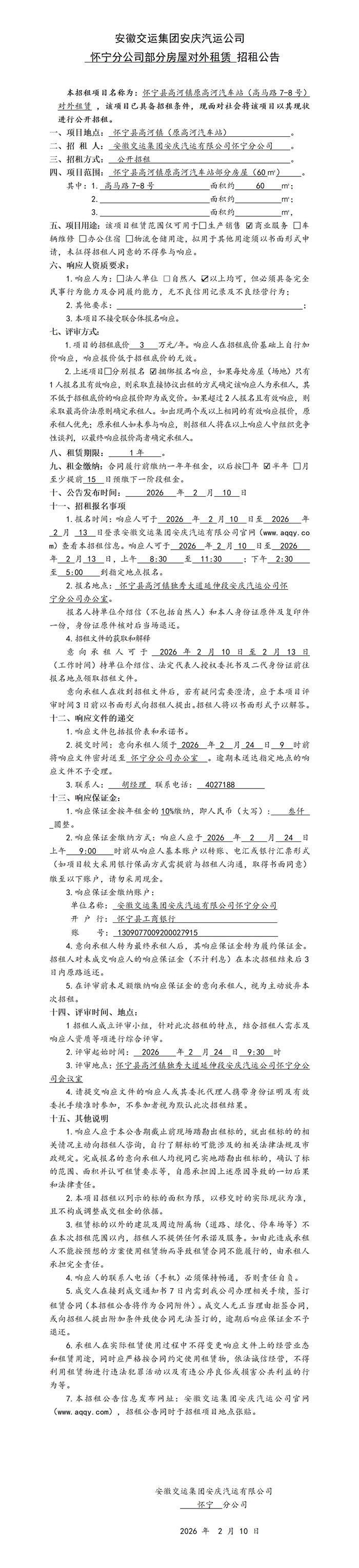 懷寧分公司部分房屋對外租賃招租公告